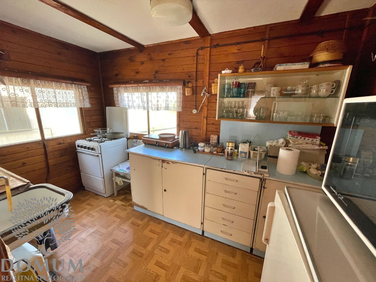Na slnečnom pozemku sa ďalej nachádza plnohodnotný obývateľný drevený záhradný domček, ktorý je dispozične rozdelený na priestrannú dennú časť, samostatnú spálňu, kuchyňu a toaletu.